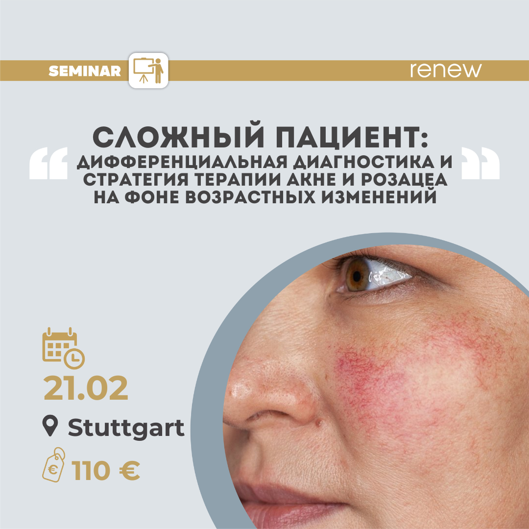 На семинаре мы разберем особенности этих состояний, механизмы их развития и стратегии профессиональной коррекции. Участников ждет сочетание теории и практики, а также готовые протоколы с использованием космецевтики Renew, проверенные на результатах.