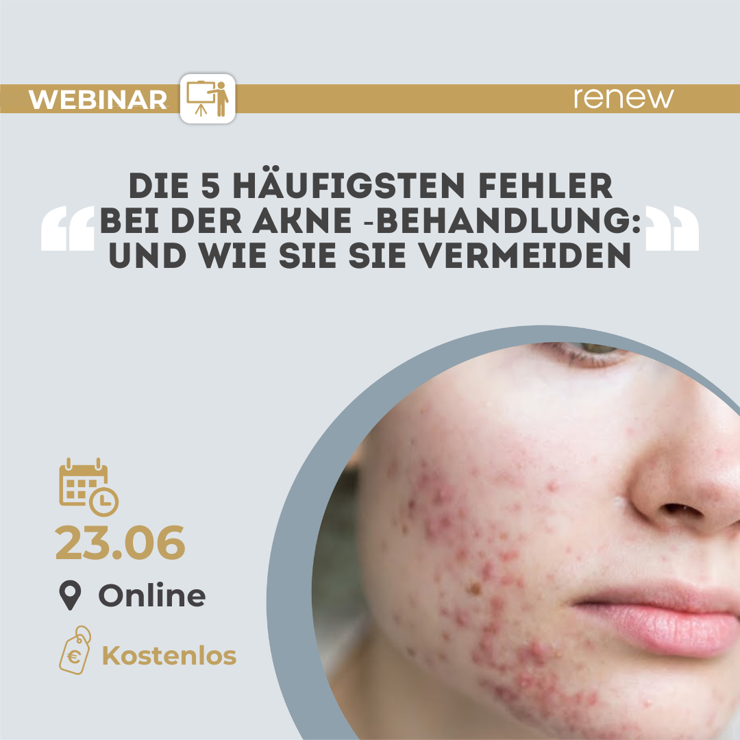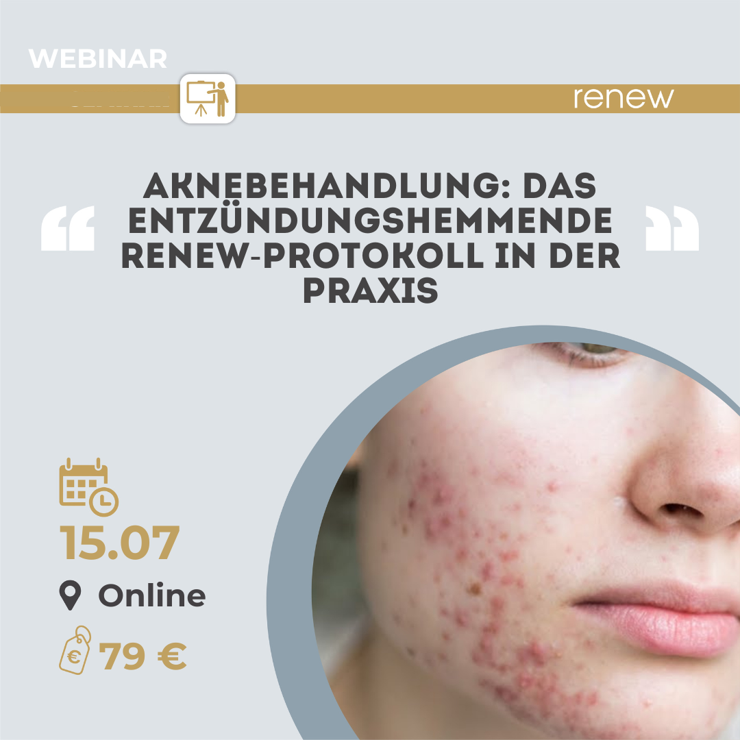 Aknebehandlung: Das entzündungshemmende RENEW-Protokoll in der Praxis Online-Webinar (Live-Demonstration) In diesem praxisorientierten Webinar erleben Sie ein professionelles entzündungshemmendes Akne-Protokoll von